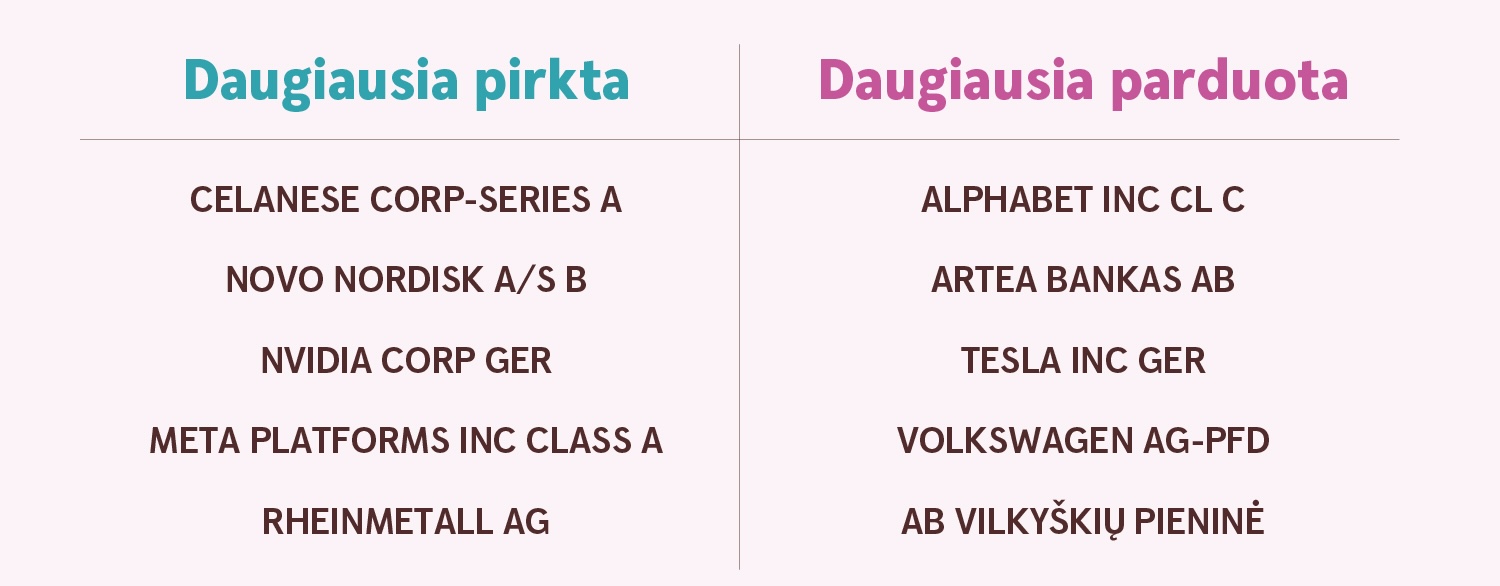 „Lapkričio mėnesį „Swedbank“ platformoje aktyviausiai pirktos „Celenese Corporation“ akcijos. Pasaulinė cheminių medžiagų gamybos įmonė lapkritį paskelbė rinkos lūkesčius viršijusius trečiojo ketvirčio rezultatus, dėl kurių akcijos kaina per mėnesį išaugo 12,4 proc. Tarp aktyviausiai pirktų akcijų taip pat pateko Danijos farmacijos milžinė „Novo Nordisk“. „Wegovy“ ir „Ozempic“ gamintoja mėnesio pradžioje su JAV administracija ir savo konkurentu „Eli Lilly“ sutarė sumažinti šių nutukimui gydyti naudojamų vaistų kainą, o per mėnesį akcijos kaina iš esmės nepakito“, – akcijų populiarumo priežastis aiškina D. Šetikas.