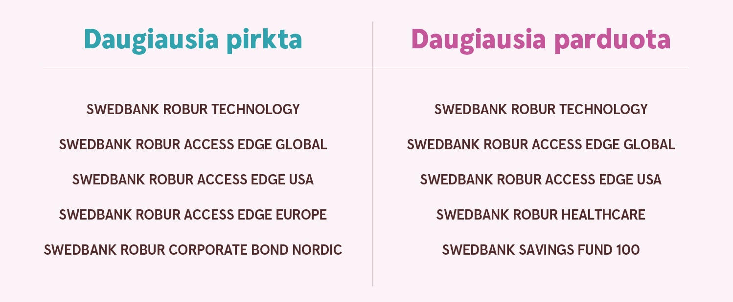 Populiariausių fondų trejetukas lapkritį nesikeitė. Nors pasaulinę rinkų situaciją ir toliau charakterizavo neapibrėžtumas dėl palūkanų normų, infliacijos ir ekonomikos raidos, lėmęs didelį nepastovumą augimo ir technologijų sektoriuose, pirmąją vietą tarp dažniausiai prekiaujamų fondų ir lapkritį išlaikė „Swedbank Robur Technology“.