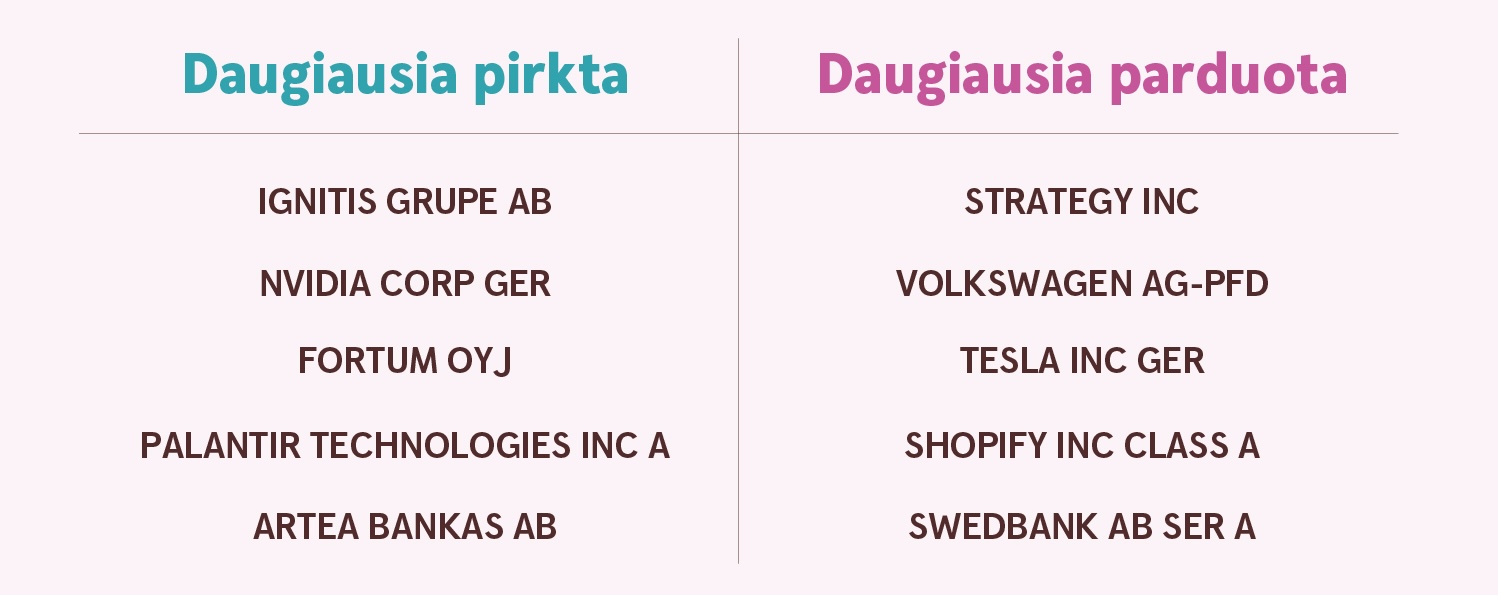 „Liepos mėnesį aktyviausiai pirkta bitkoino iždininkės „Strategy“ akcija rugpjūtį jau rikiavosi prie labiausiai parduodamų. Įmonės kaina per mėnesį smuko virš 16 proc., o prie to galėjo prisidėti apie 7 proc. mažėjusi bitkoino kaina“, – sako.