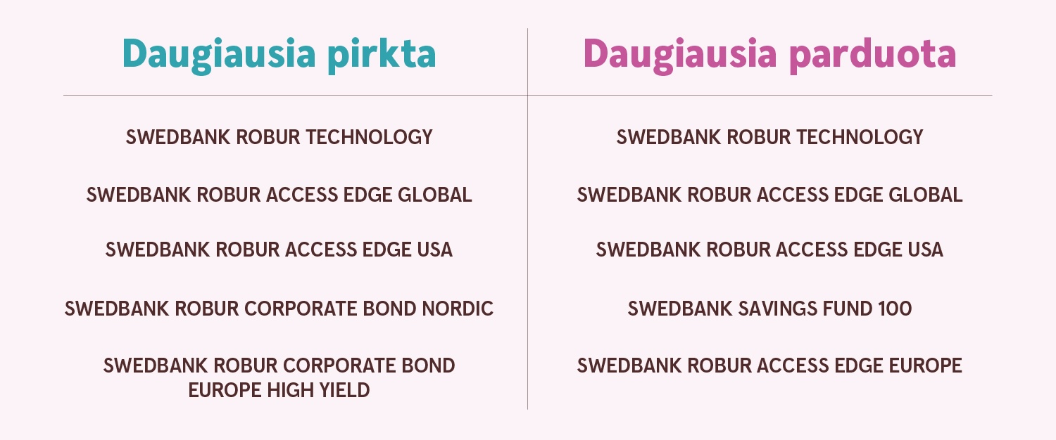 Tarp dažniausiai įsigyjamų fondų aukščiausią poziciją užėmė „Swedbank Robur Technology“ fondas. Fondo vertės augimui rugpjūtį, kaip jau kurį laiką, daugiausia įtakos turėjo DI įmonių bei puslaidininkių gamintojų sėkmė.