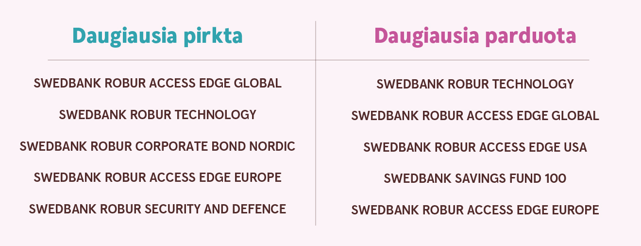 Tuo tarpu tarp aktyviausiai parduodamų fondų pirmosios trys pozicijos išliko nepakitusios: pirmoje vietoje „Swedbank Robur Technology“, antroje vietoje „Swedbank Robur Access Edge Global“, o trečioje – „Swedbank Robur Access Edge USA“. Ketvirtoje daugiausia parduodamų fondų vietoje atsidūrė „Swedbank Savings Fund 100“.