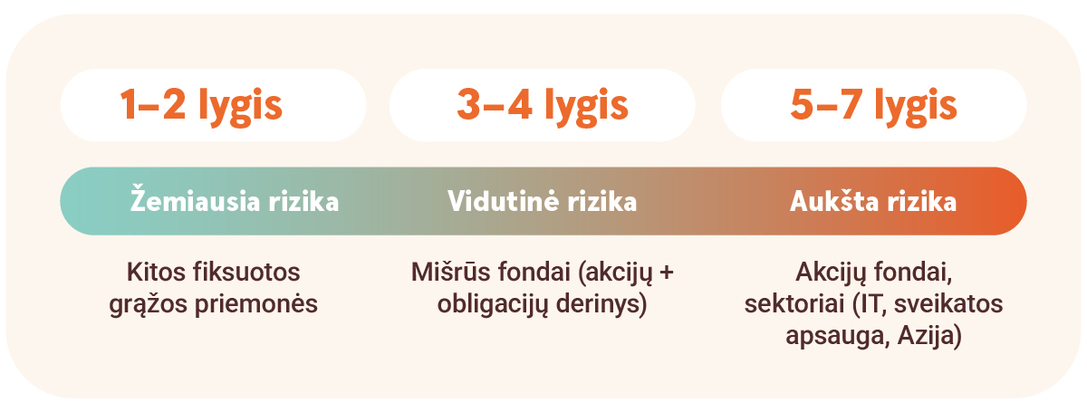 Rinkdamiesi fondus, prie jų matysite ir įvairių skaičių bei diagramų, pavyzdžiui, fondo vertės pokytis per tam tikrą laikotarpį, trumpojo ir ilgojo laikotarpio grąža ir pan. Vienas iš rodiklių, į kurį verta atkreipti dėmesį pradedantiesiems investuotojams – konkretaus fondo rizikos lygis, kuris svyruoja nuo vieneto iki septynių. Kuo aukštesnis šis rodiklis, tuo potenciali investicijų grąža ir rizika yra didesnė. Rizikos rodiklis grindžiamas tuo, kaip fondo grąža svyravo laikui bėgant, palyginti su fondo vidutine grąža per pastaruosius penkerius metus. Fondas, kuris priskiriamas aukštesniam rizikos lygiui, paprastai turi didesnę istorinę grąžą, tačiau kartu ir didesnę fondo vertės sumažėjimo riziką per trumpesnį laikotarpį. Didesnės rizikos fondai paprastai investuoja į įmonių akcijas, o saugesni fondai, kurių vienetų vertės svyravimai yra mažesni, įprastai sudaromi iš obligacijų. Prie kiekvieno investicinio fondo aprašymo rasite išsamią informaciją, į kokias turto klases jie investuoja ir koks yra kiekvieno rizikos lygis. Kiekvienas fondas turi priskirtą rizikos rodiklį nuo 1 iki 7. Kuo aukštesnis skaičius, tuo didesnė vertės svyravimo rizika ir potenciali grąža.