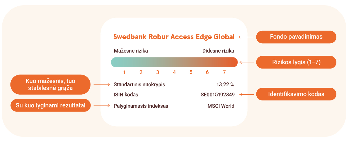 Pasirinkę fondą, interneto banke ar programėlėje matysite jo detalų aprašymą su įvairiais rodikliais. Iš pirmo žvilgsnio jie gali pasirodyti sudėtingi, tačiau suprasti esmę visai paprasta. Panagrinėkime „Swedbank Robur Access Edge Global“ fondo pavyzdį, kad pamatytumėte, ką reiškia svarbiausi terminai:
