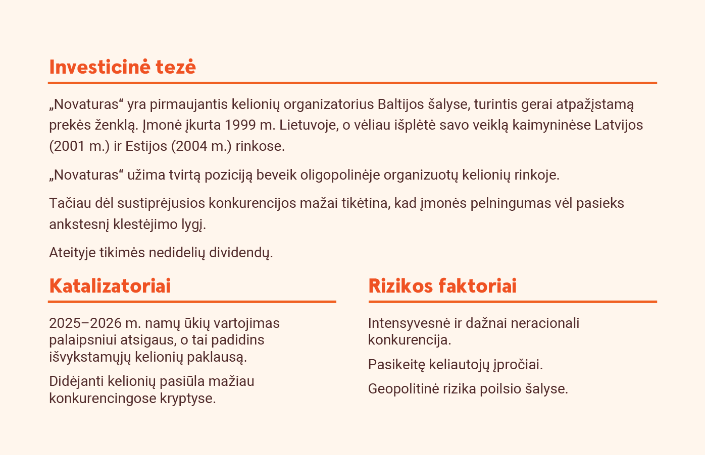 Išlaikome 2026 m. prognozuojamas pajamas 175 mln. eurų lygyje, o tai reiškia maždaug 4 procentų augimą, palyginti su praėjusiais metais, arba atitinka Grupės prognozes. Tuo pačiu metu 2026 m. EBITDA prognozę sumažiname 6 proc. – iki 2,5 mln. eurų (2,7), o grynąjį pelną mažiname beveik trečdaliu – iki 0,7 mln. eurų (1,1). Pastarasis rodiklis atspindi didelės konkurencijos, brangesnių vežėjų paslaugų ir trapios finansinės padėties poveikį. Atsižvelgdami į mažesnius prognozuojamus rodiklius, sumažinome tikslinę kainą iki 1,0 (1,4) euro, kuri Grupę vertina 7,8x 2026 m. prognozuojamo EBITDA rodiklio ir 11,3x grynojo pelno. Pakartojame savo „Neutralią“ rekomendaciją.