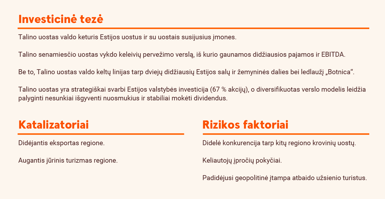 Atsižvelgdami į krovinių apimčių padidėjimą ir sumažintą finansinę naštą (sumažinome prognozuojamas palūkanų išlaidas 1 mln. eurų), padidiname mūsų 2025 m. prognozuojamą grynąjį pelną 9,2 proc. - iki 24,7 mln. eurų. Pakeliame savo tikslinę kainą iki 1,35 euro (1,30), o tai reiškia, kad Talino uostas vertinamas 8,7x 2025 m. prognozuojamo EBITDA, 14,4x grynojo pelno ir 0,9x akcijos buhalterinės vertės, t. y. vis dar žemiau nei ilgalaikiai vidurkiai, kurie atitinkamai yra 9,7x, 16,3x ir 1,1x. Be to, manome, kad 2025 m. dividendai bus tokie patys kaip 2024 m., t. y. 0,073 EUR (6 proc. pajamingumas). Manome, kad dabar yra tinkamas momentas įsigyti Talino uosto akcijų, atsižvelgiant į „Railway Baltica“ užsakymų terminus ir augimo potencialą bei patrauklų dividendų pajamingumą, todėl didiname rekomendaciją iki „Pirkti“ („Neutrali“).