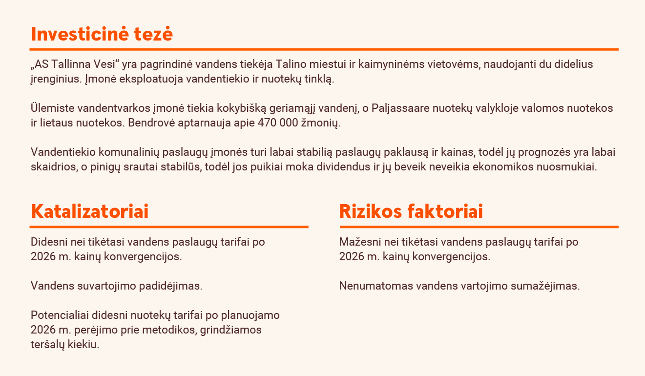 Darome prielaidą, kad dividendų išmokėjimo koeficientas sudarys 80 % (t. y. aukštesnę „Tallinna Vesi“ politikos ribą), ir prognozuojame, kad 2025 m. prognozuojami vienai akcijai tenkantys dividendai (DPS) sieks 0,51 EUR, kas, esant dabartinei rinkos kainai, atitinka 4,8 % dividendinį pajamingumą. Vis dėlto, po galutinio prognozuojamo tarifo padidinimo tikimės, kad 2026–2027 m. prognozuojami DPS padidės iki atitinkamai 0,60 EUR ir 0,65 EUR, o tai reikštų vidutinį 5,9 % dividendinį pajamingumą. Kartojame 10,3 EUR tikslinę kainą ir neutralią rekomendaciją. Mūsų tikslinė kaina vertina bendrovę 12,4x 2025 m. prognozuojamo EBITDA ir 16,0x grynojo pelno, t. y. arti istorinių vidurkių.