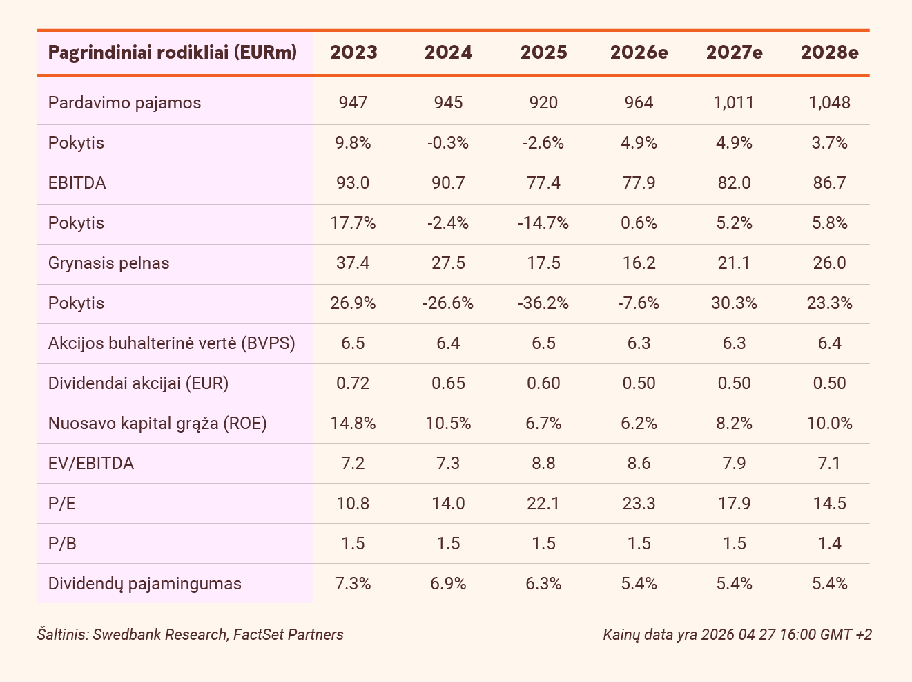 Šiame straipsnyje pateiktą rekomendaciją ir tikslinę kainą grindžia akcijos analizė, paruošta 2026 m. balandžio 27 d. 12.33 val. ir paskelbta 2026 m. balandžio 27 d. 12.33 val. Tačiau tai gali būti ne paskutinė paskelbta akcijos analizė. Naujausios akcijų rekomendacijos ir tikslinės kainos yra prieinamos tik „Swedbank“ mokamos analizės klientams.
