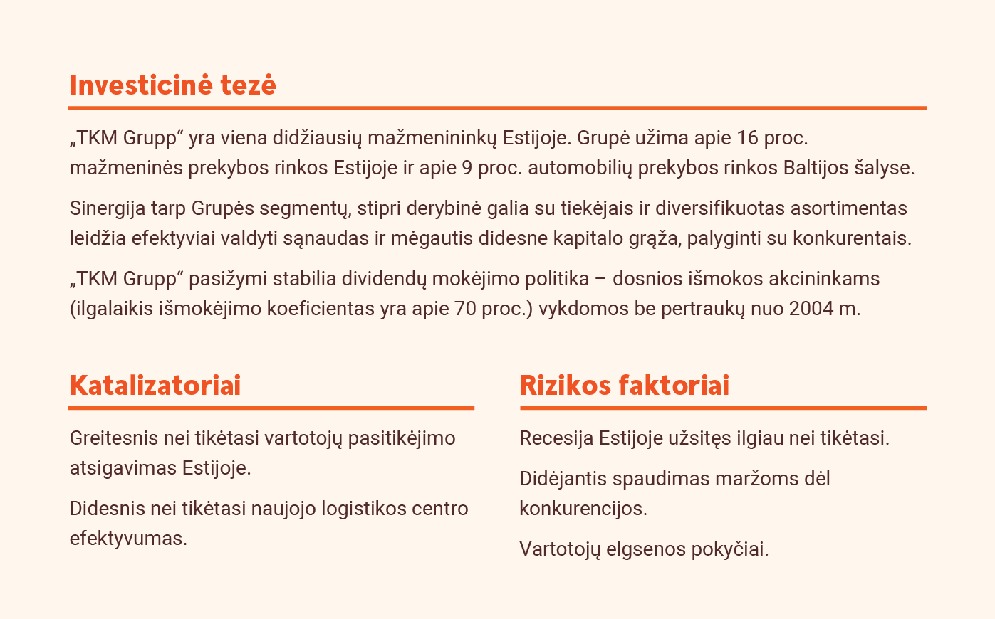 Apibendrinant, mūsų prognozės iš esmės nesikeičia, tačiau padidiname Baltijos šalių lengvųjų transporto priemonių rinkos perspektyvą 2026 m., atsižvelgdami į stiprų pirmojo ketvirčio impulsą. Paliekame 9,0 EUR tikslinę kainą ir Neutralų vertinimą. Mūsų tikslinė kaina vertina TKM 8,6x prognozuojamo EBITDA ir 1,5x akcijos buhalterinės vertės, palyginti su ilgalaikiais vidurkiais – atitinkamai 8,4x ir 1,6x.