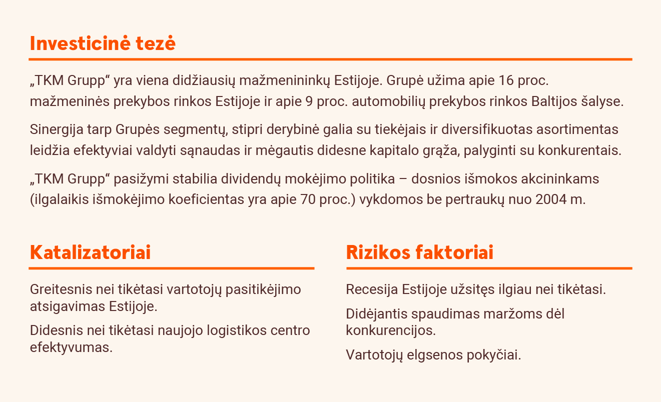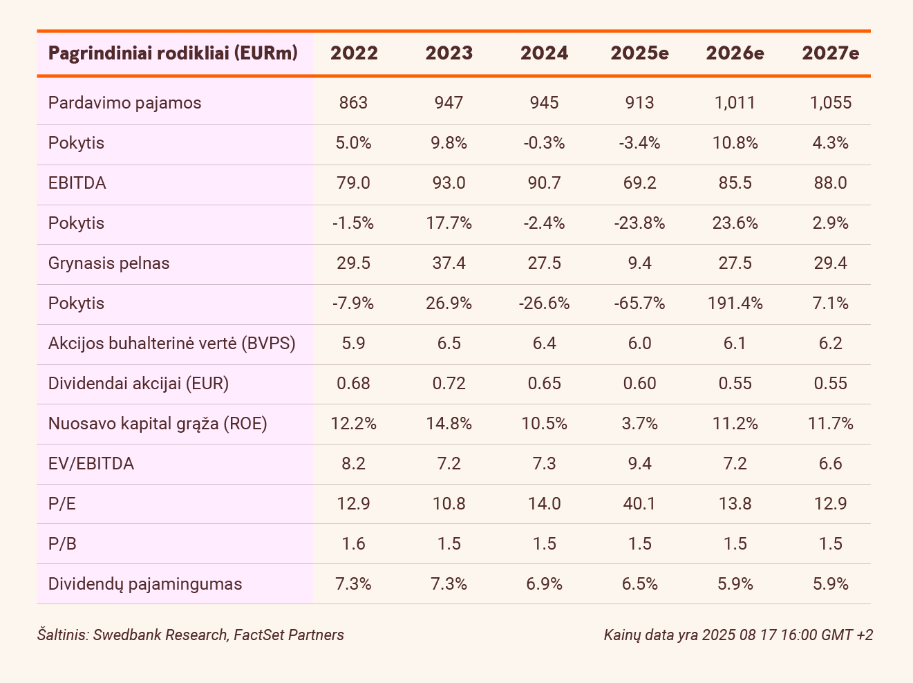Remiantis sumažėjusiomis prognozėmis, koreguojame savo tikslinę kainą iki 9,0 eurų, kuri „TKM Grupp“ vertina 9,2x 2025 m. prognozuojamo EBITDA. O tai yra gerokai daugiau už 10 metų vidurkį (8,4x). Atsižvelgiant į šių metų trumpalaikį poveikį, manome, kad 2026 m. EV/EBITDA jau atsigaus iki 7,1x. Rinkos vertinimą laikome gana teisingu, todėl ir toliau teikiame „Neutralią“ rekomendaciją.