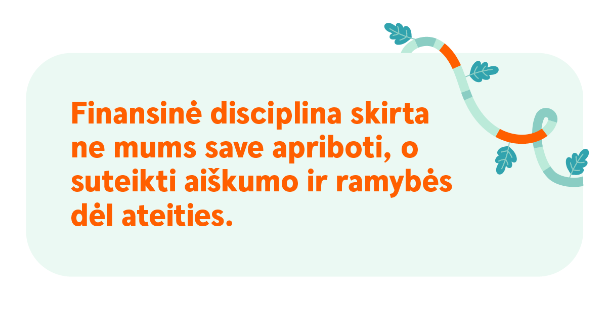 Jaučiant nerimą dėl finansinės situacijos, verta pasikalbėti su artimaisiais, pasidalinti tuo, ką jaučiame. Jei su artimaisiais kalbėtis sunku ir norisi emocinės paramos – galima susisiekti su „Jaunimo linija“. Pagalbos prašymas nėra silpnumo ženklas, tai sąmoningas būdas pasirūpinti savo ateitimi.