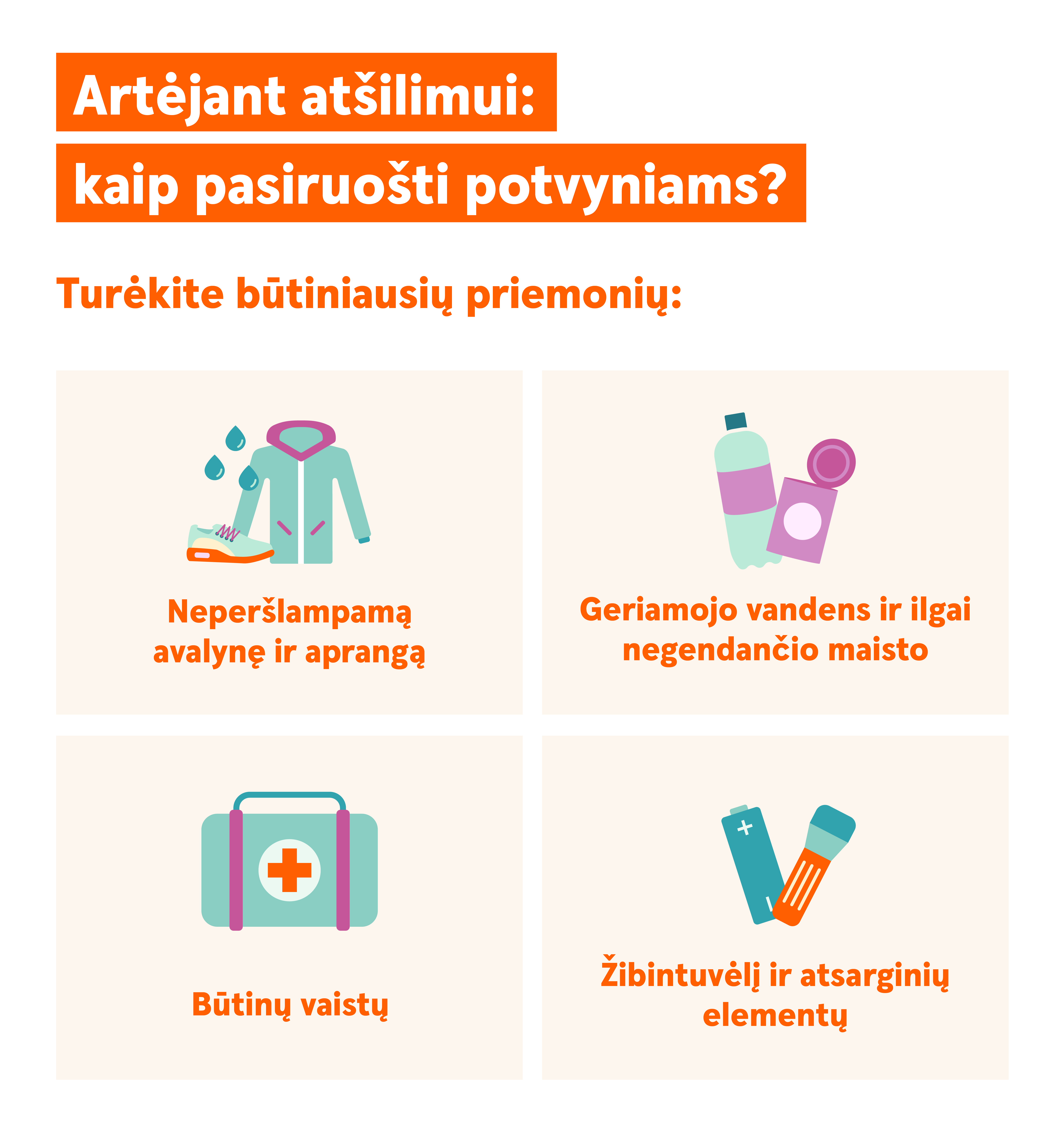 Ekspertai primena, kad potvynio metu nereikėtų bandyti važiuoti ar eiti per užlietas vietas, net jei vanduo atrodo negilus. Po vandeniu gali būti pažeista kelio danga, atviri šuliniai ar stipri srovė. Gavus oficialius perspėjimus ar nurodymus evakuotis, rekomenduojama jų laikytis ir nebandyti savarankiškai vertinti rizikos, ypač šalia upių, kai juda ledas ar formuojasi sangrūdos.